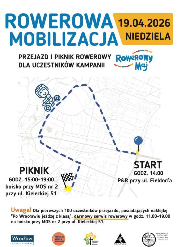 Szanowni Państwo, 16.04 w ramach akcji „Rowerowy Maj” każde dziecko otrzyma odblaskowa naklejkę na rower lub hulajnogę, która będzie upoważniała do darmowego serwisu rowerowego w trakcie wydarzenia Rowerowa Mobilizacja, która odbędzie się dnia 19.04.2026 (niedziela), w godzinach 14.00-19.00 w trzech lokalizacjach we Wrocławiu: